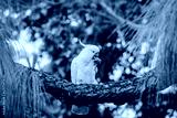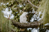 A white cockatoo bird sitting on a tree branch of a pine tree nibbling on something tasty outdoor at daytime in the Royal Botanical Gardens during winter in Sydney Australia.
