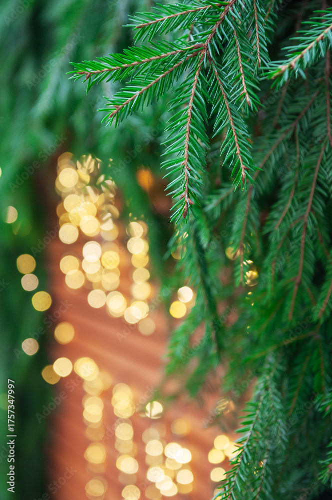 Green pine needles glow with golden bokeh creating festive natural atmosphere
