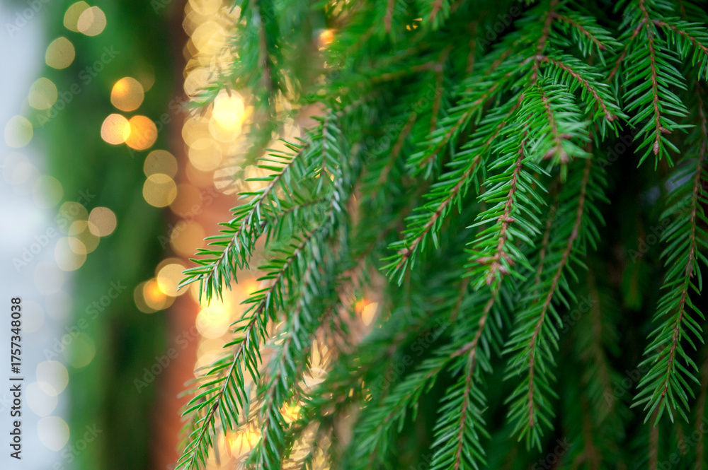 Green pine needles glow with golden bokeh creating festive natural atmosphere
