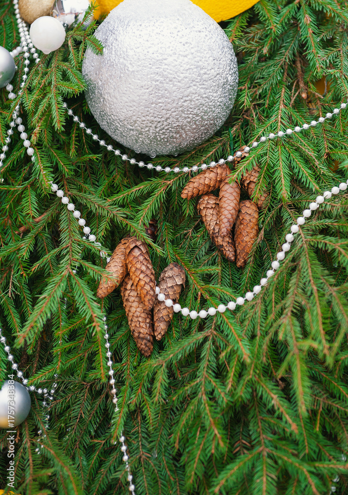 Sparkling Christmas balls and pinecones hang among green spruce branches create a joyful winter mood