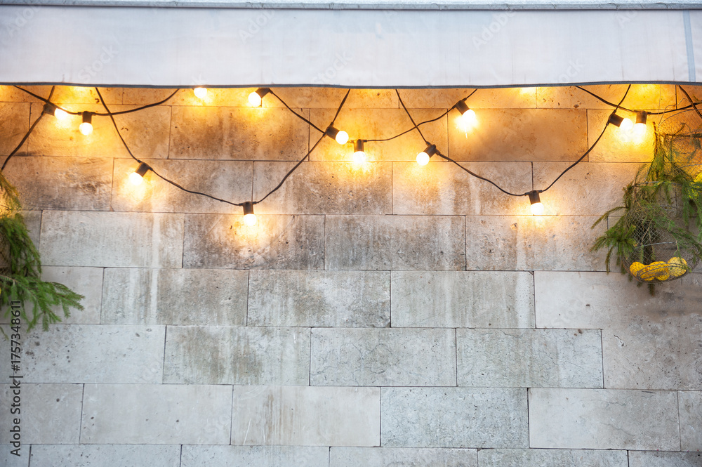 String lights glowing on a stone wall with pine branches create festive Christmas outdoor holiday decor