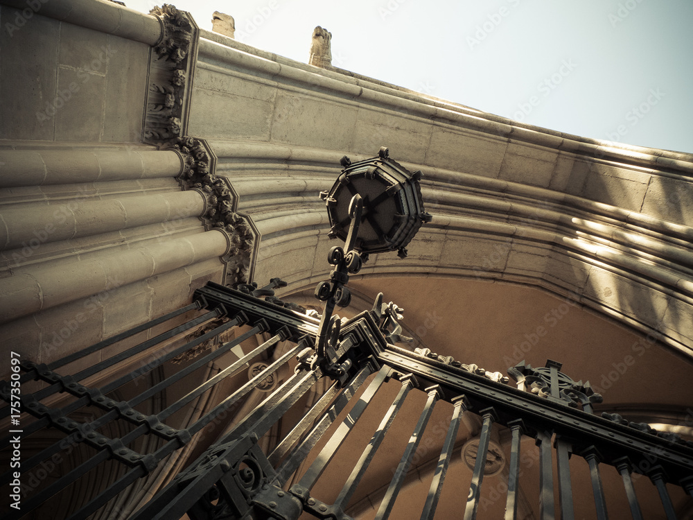 Vintage iron gate and gothic arch under soft light, viewed from below with architectural elegance. Historic iron gate and ornate lamp under stone archway, captured from below with dramatic view.