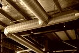 Close-up view of a metallic air duct ventilation system installed along the ceiling of a modern industrial-style building.