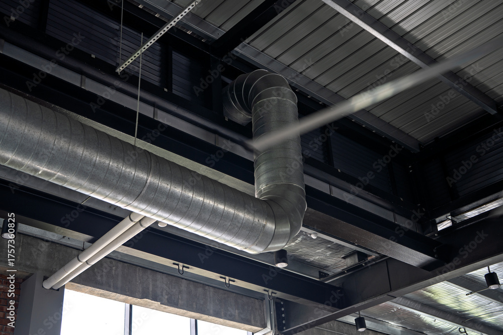 Close-up view of a metallic air duct ventilation system installed along the ceiling of a modern industrial-style building.