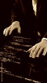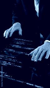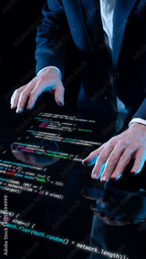 Hands on transparent digital surface with luminous programming code in futuristic composition. Concept of research technology, interactive design, and innovation in scientific visualization.