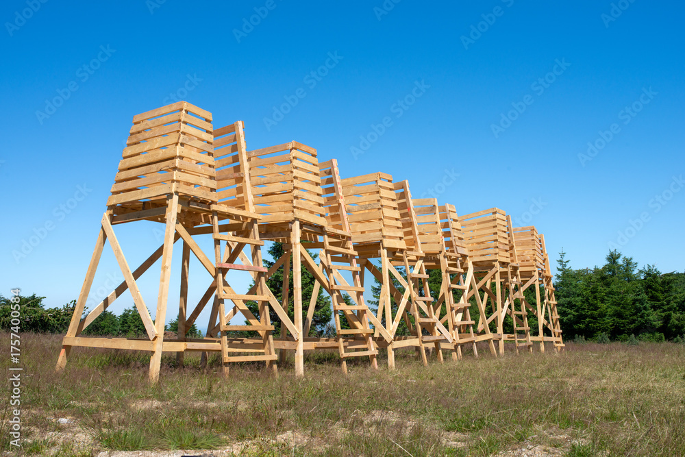Row of tall wooden platforms with ladders under construction in open field, modular timber scaffolding framework against clear blue sky, engineering and carpentry concept
