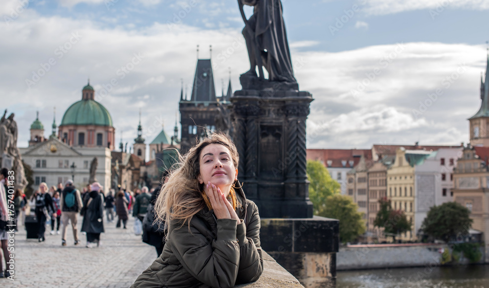 Young woman traveling in Prague, Czech Republic, city view and lifestyle moment