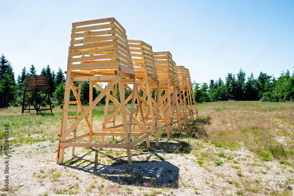 Row of elevated wooden observation platforms with ladders in open field, modular timber scaffolding framework under construction against clear blue sky, engineering and carpentry concept