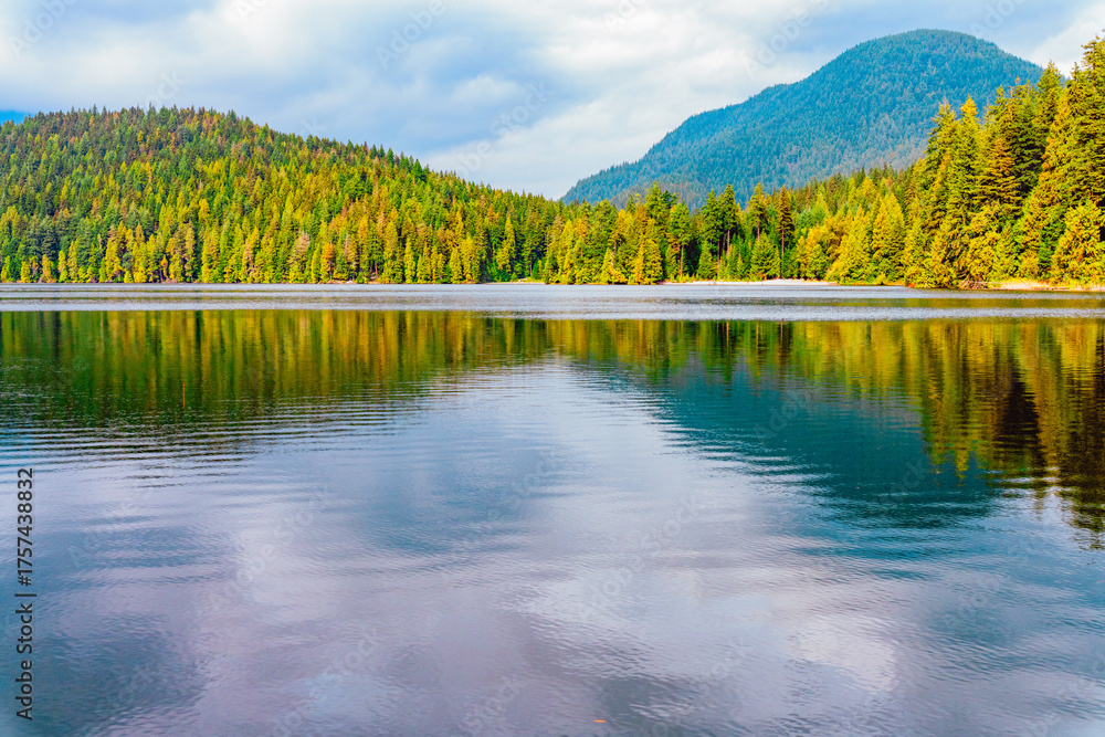 Scenic view across tranquil BC freshwater lake to forest with mountain backdrop.