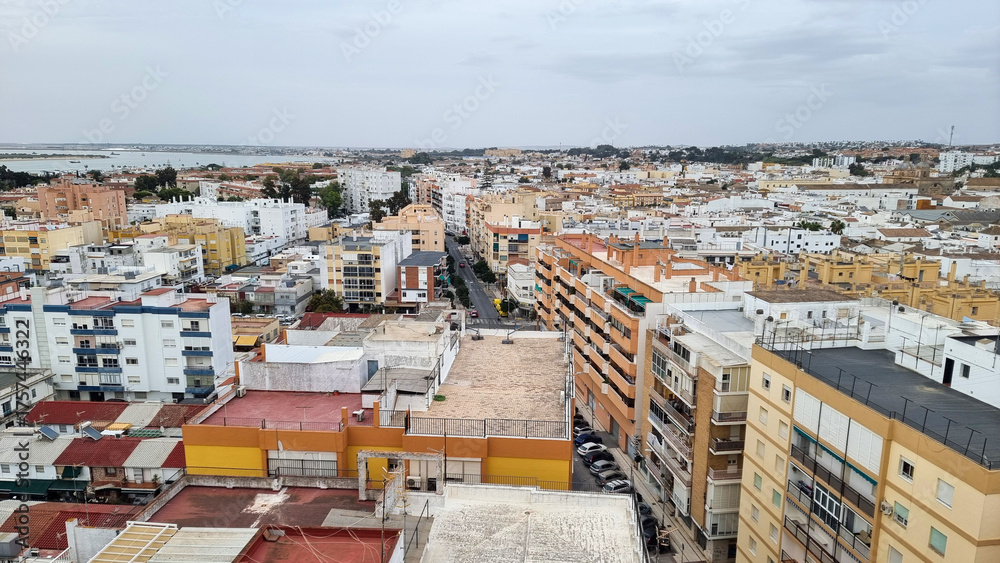 Aerial view of Sanlúcar de Barrameda, next to the mouth of the Guadalquivir River, in the province of Cadiz, Andalusia, Spain.