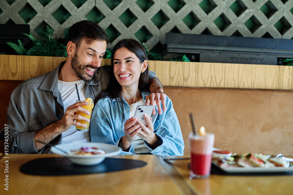 Portrait of ayoung romantic couple in restaurant having lunch and using a mobile phone