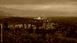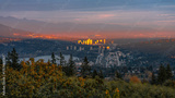 Aerial view of Fraser Valley, BC, Canada with setting sun highlighting high-rise buildings in Coquitlam town centre.