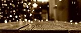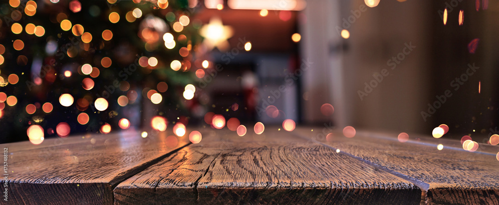 Wooden Background with Blur Effect. Christmas Tree and Garland Lights. Home holiday background