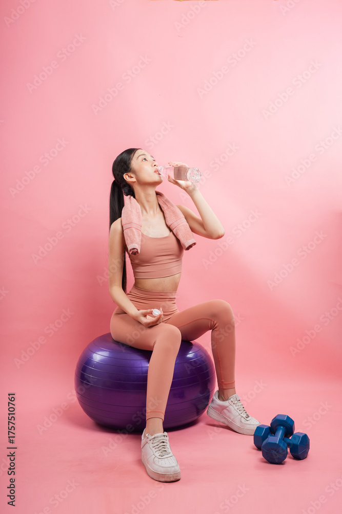 Hydrated and healthy Woman drinking water after workout sitting on fitness ball Pink background
