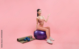 Young woman smiling sitting on balance ball with workout gear on pink background Fitness time
