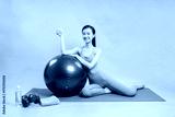 Smiling asian woman with a thumbs up resting on a purple exercise ball after her workout