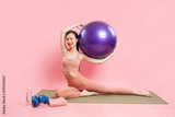 Smiling woman with fitness ball exercising on a yoga mat promoting healthy lifestyle