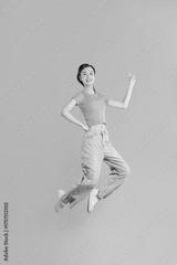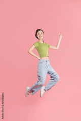 An energetic young person leaps for joy against a vibrant pink background with an up beat pose