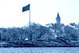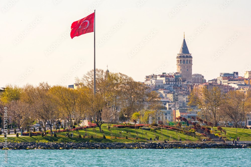 Flag of Turkey in Sarayburnu park with Galata tower at background, Istanbul, Turkey