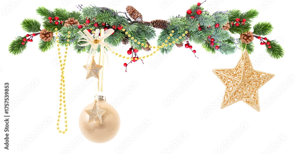 decorative balls on fir tree, Christmas garland isolated on transparent background