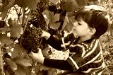 Fight picking grapes in vineyard. Happy child taking grapes from vine in autumn