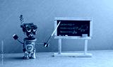Math lesson in college. Robot teacher explains theory inverse trigonometric functions. Classroom interior with handwritten formula black chalkboard. Blue green colorful background.