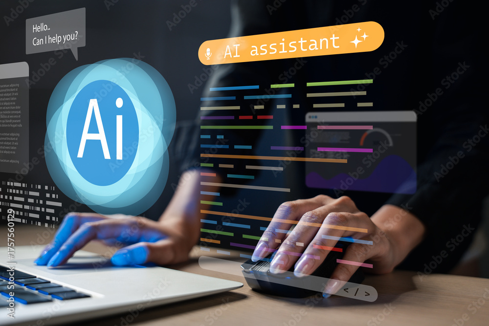AI coding assistant for software development concept. AI assistant interface, coding screen, and virtual assistant icons, representing artificial intelligence technology and digital innovation.