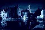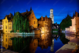 Historic Bruges Rozenhoedkaai Night Reflection. Dusk on the historic Rozenhoedkaai of Bruges, Belgium, with medieval buildings, canal and belfry.