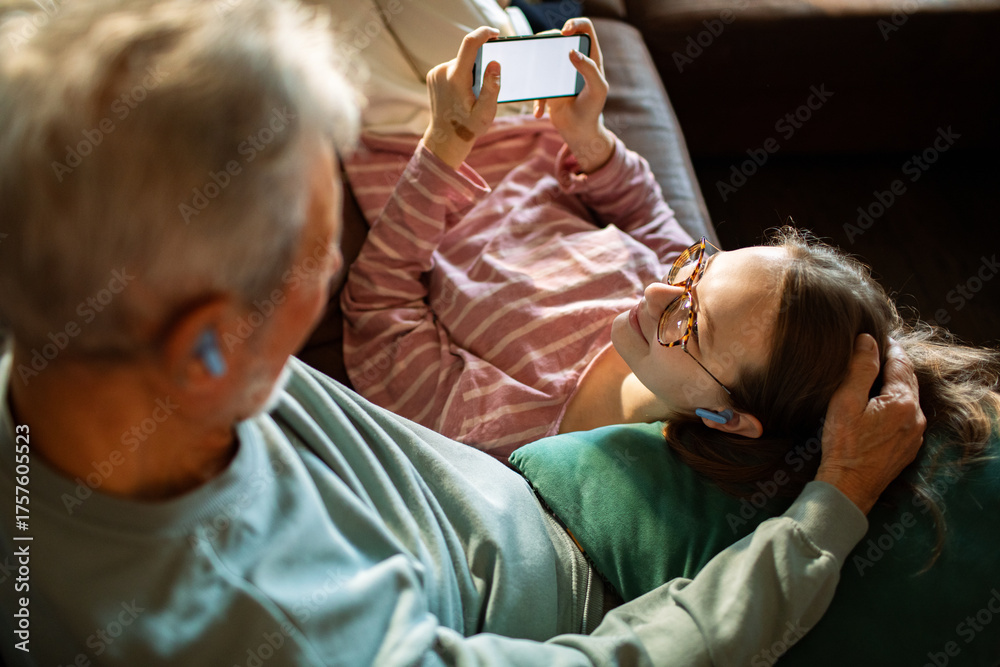 Grandfather and granddaughter using smartphone at home