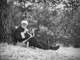 Santa Claus rest and drinking hot coffee with big gingerbread.