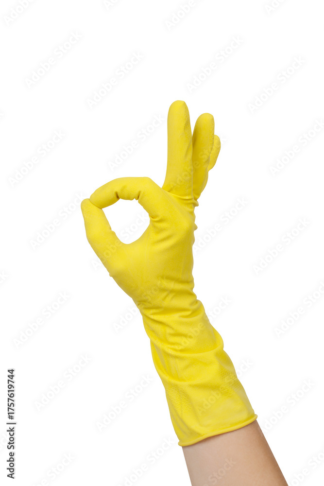 Hand Wearing Yellow Rubber Glove Shows OK Sign Isolated on White and Png Transparent Background, Clipping Path Included