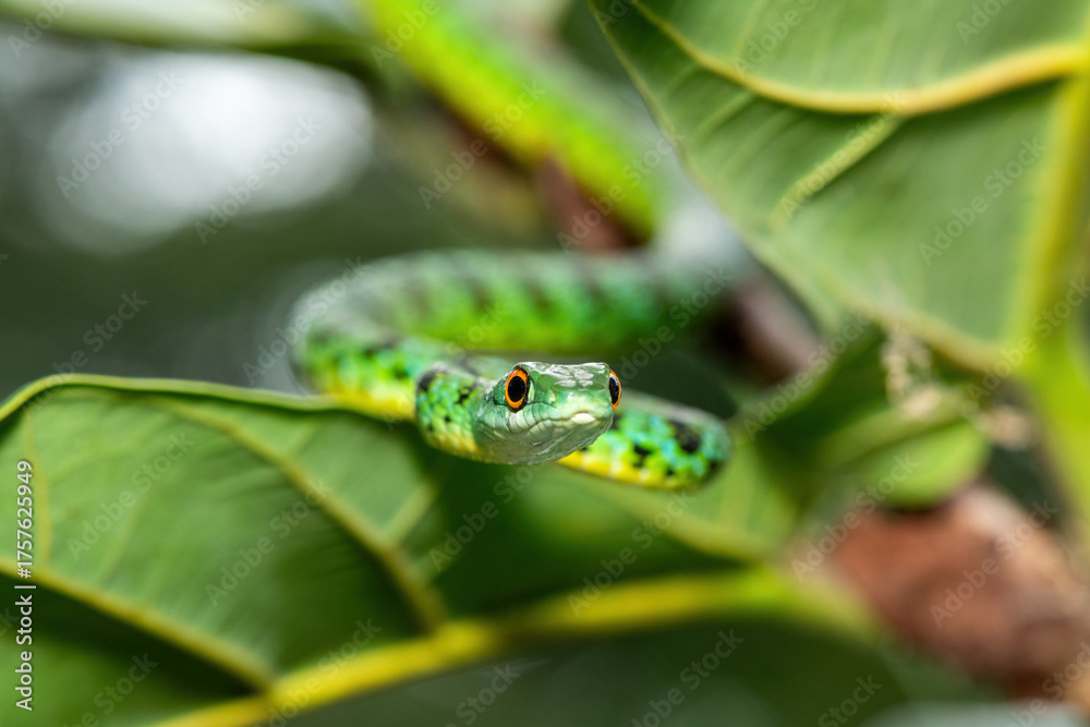 An adorable Spotted Bush Snake (Philothamnus semivariegatus) climbing a small tree – Non-venomous endemic African reptile