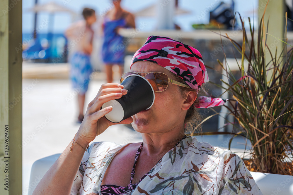 Close up view of woman in pink bandana drinking coffee from paper cup while relaxing on beach with people on background. Greece.