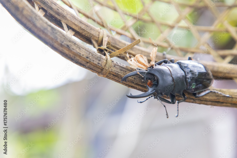 Majestic stag beetle clinging to branch, displaying its powerful mandibles in a natural outdoor habitat, creating an earthy vibe perfect for nature projects