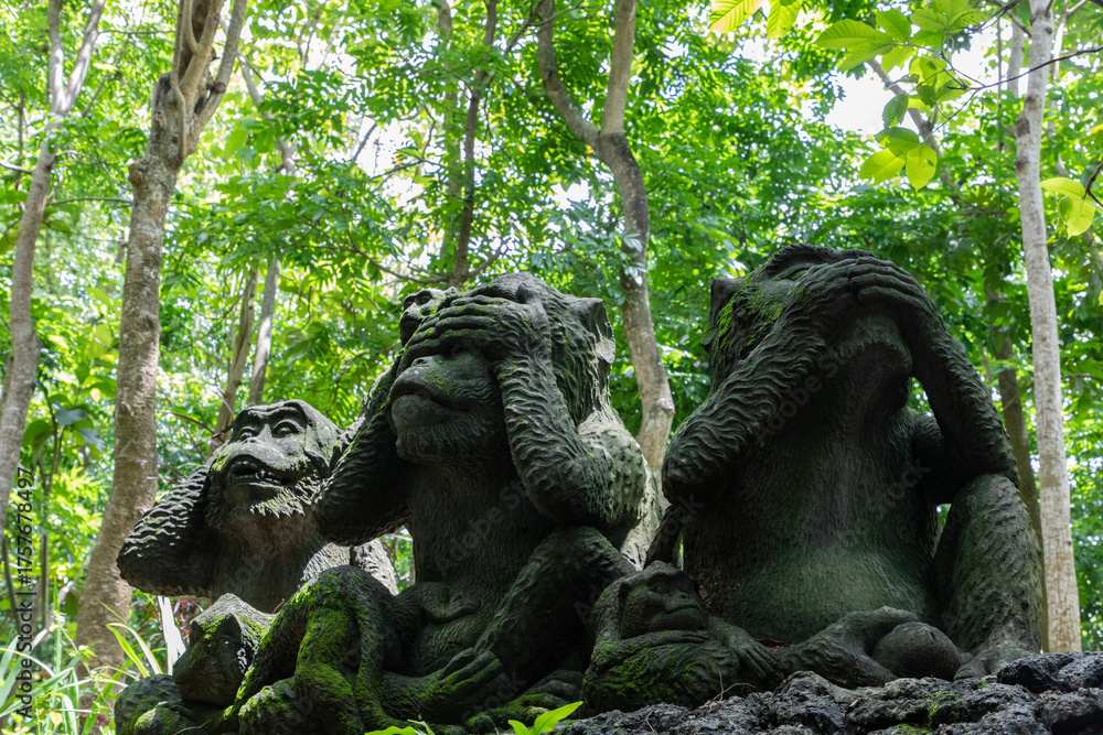 Mystical monkey statues embody see no evil, hear no evil, speak no evil in lush jungle setting, perfect for travel, cultural, and spiritual content