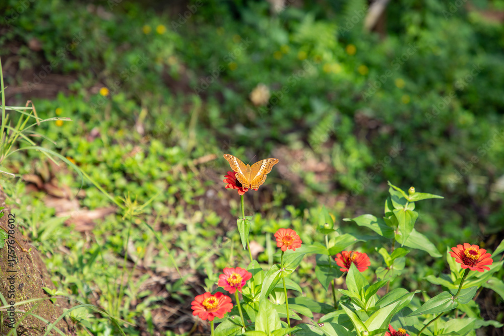 Stunning butterfly gracefully lands on vibrant red zinnia in sun-drenched summer garden, nature's beauty and delicate ecosystem at work