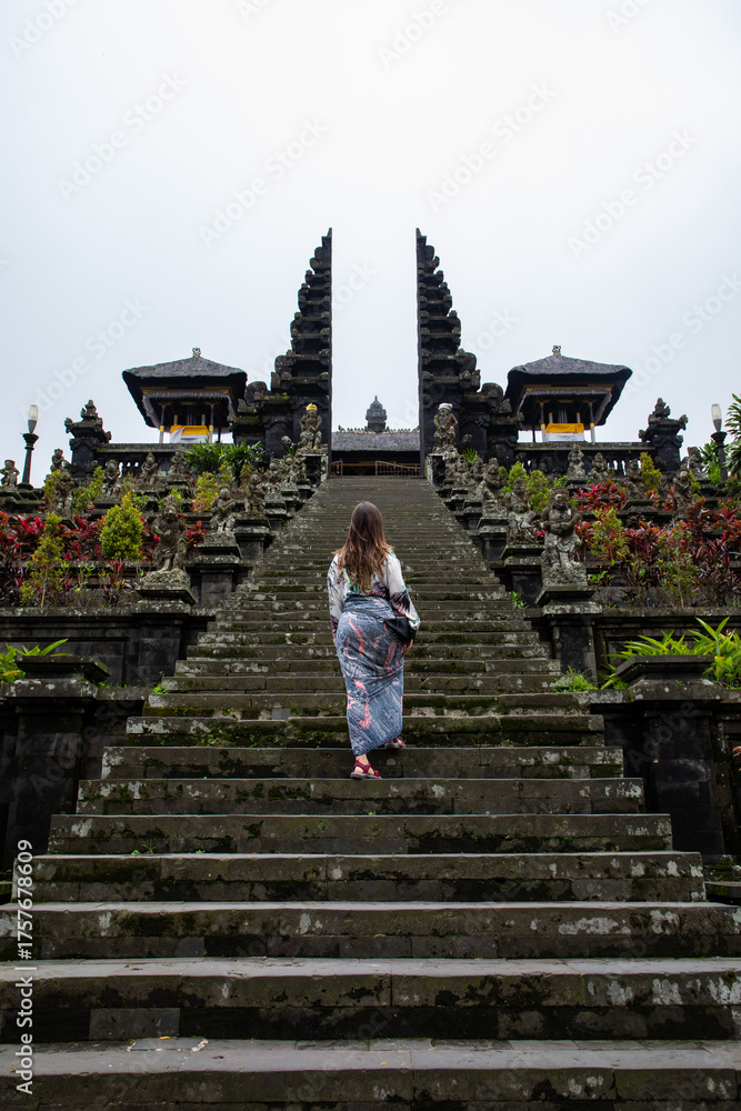 Young woman exploring Bali's majestic Lempuyang Temple, ascending stone steps to heaven, capturing cultural travel and spiritual journey in Indonesia