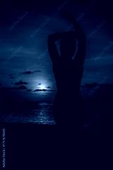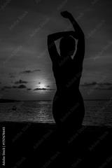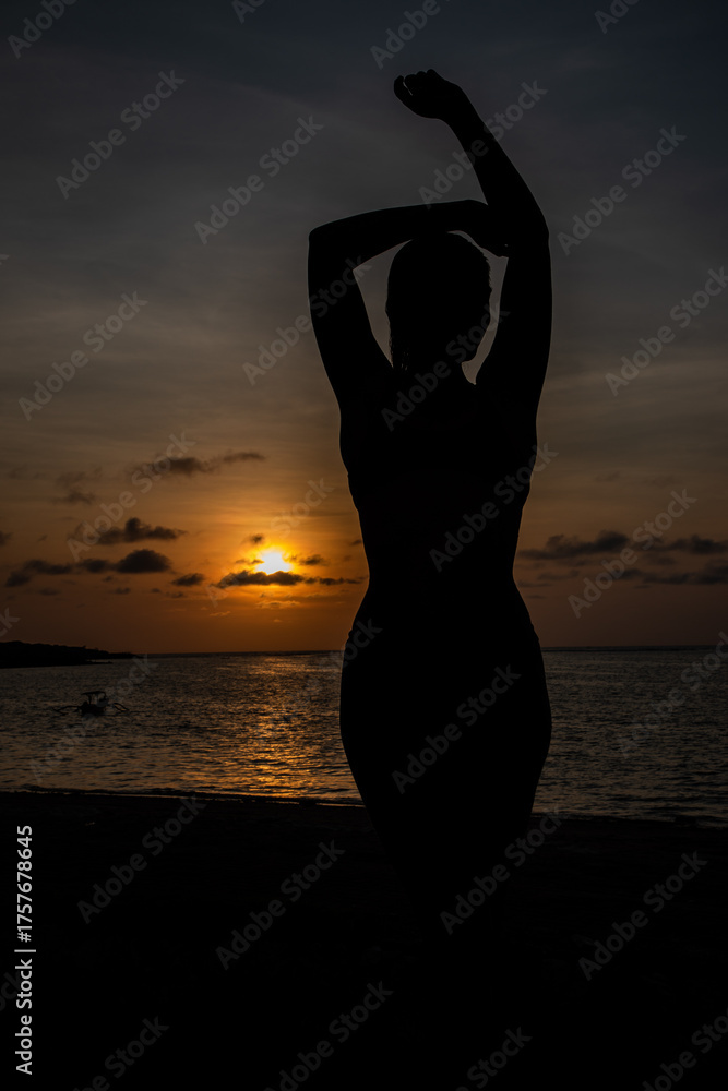 Silhouette of a woman enjoying a stunning sunset beach vacation, feeling free and relaxed by the ocean with vibrant colors and a peaceful, calming atmosphere