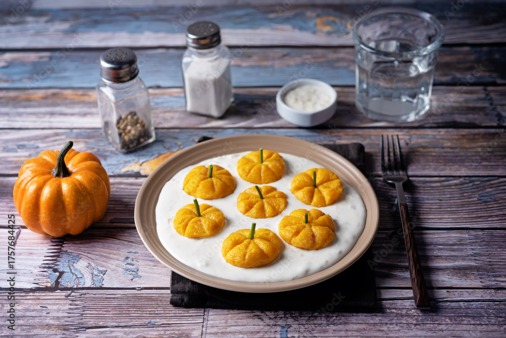 Fresh prepared pumpkin gnocchi in the form of pumpkin with garlic cream sauce