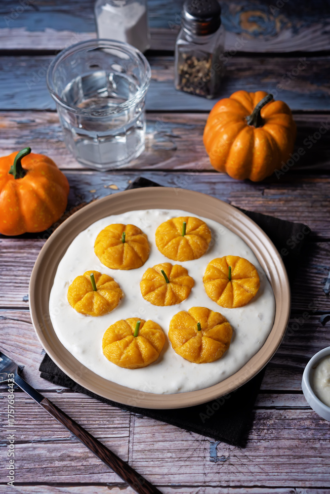 Fresh prepared pumpkin gnocchi in the form of pumpkin with garlic cream sauce