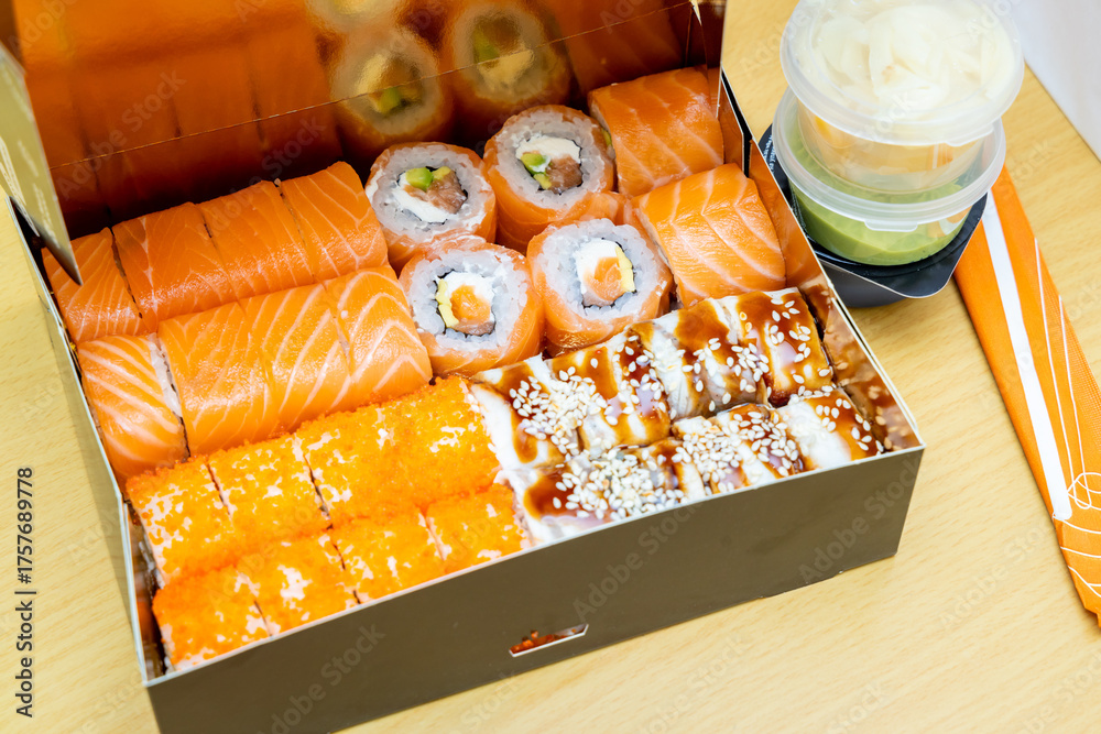 Delicious fresh sushi rolls assortment packed in black takeaway box. Takeaway or home delivery. Japanese cuisine concept