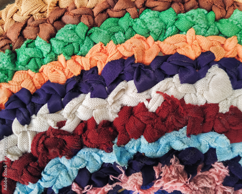 Close-up of a colorful handmade rug woven from many different strips of fabric. The background is a vintage antique floor covering with an abstract pattern.