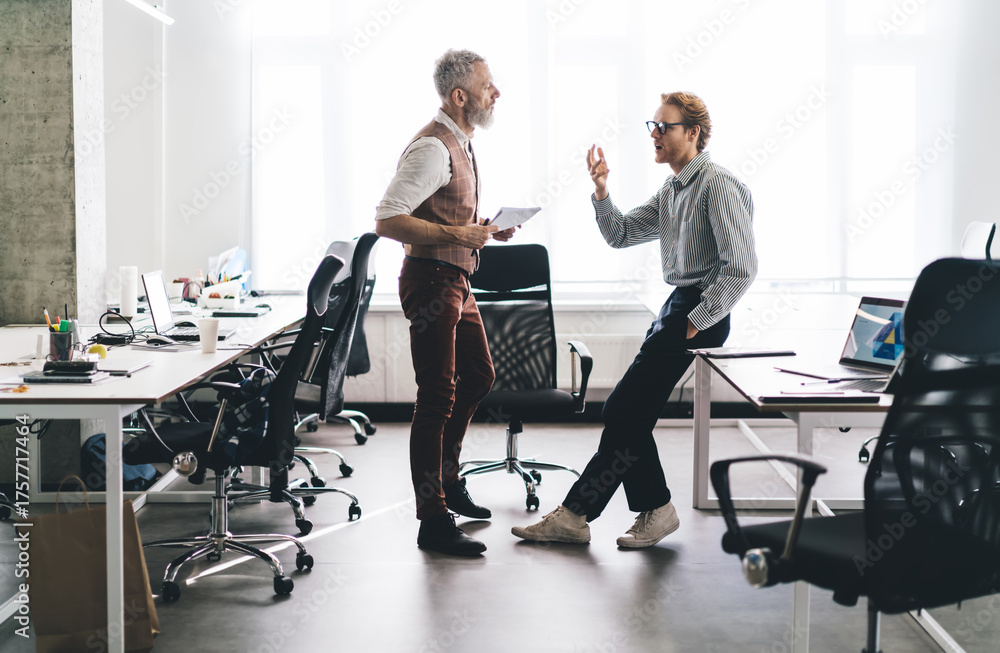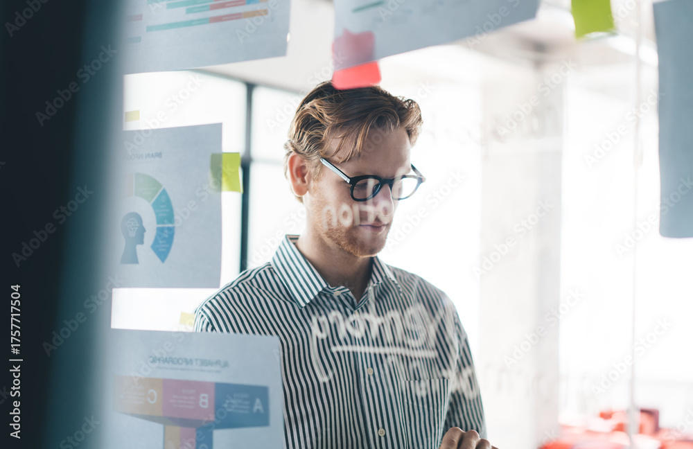 Young male freelancer studies printed charts on glass board, standing with tablet in tech-driven workspace. Concept highlights digital focus, self-direction, and strategic business thinking.