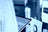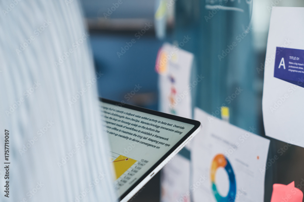 Close-up of male hand holding tablet displaying chart in front of infographic board. Represents data focus, hybrid tools, and layered information systems in startup work environments.