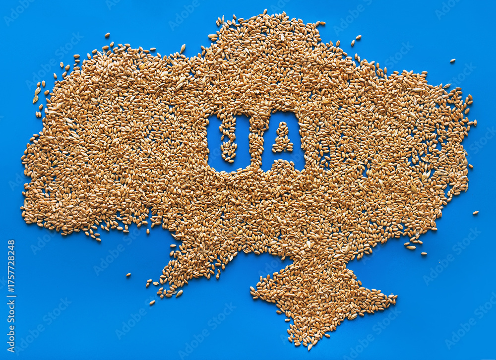 Map of Ukraine and name made from wheat grains. Export of grain to Europe. The concept of a supply crisis through Poland and famine due to the war unleashed by the Russia.