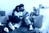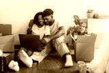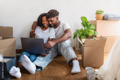 Smiling African American couple sitting on the floor among moving boxes, using a laptop together. Happy moment of love, teamwork, and excitement while planning their new home life