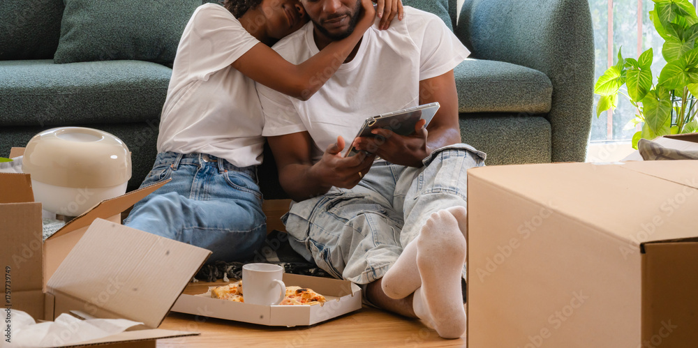 Young couple sitting on the floor among moving boxes, eating pizza and browsing on a tablet while relaxing in their new home