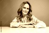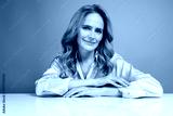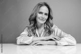 Elegant mature woman with blonde hairstyle relaxing against pink background in stylish outfit