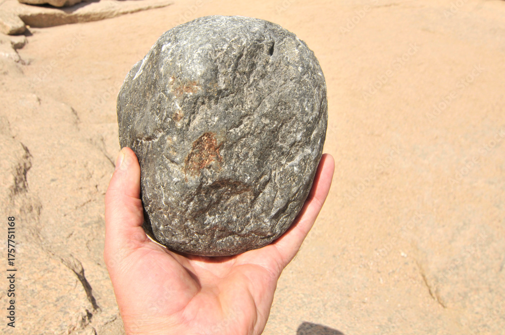 Stone balls of doleryt volcanic rock for chipping tool of granite processing in the Aswan Red Granite Quarry, Egypt
