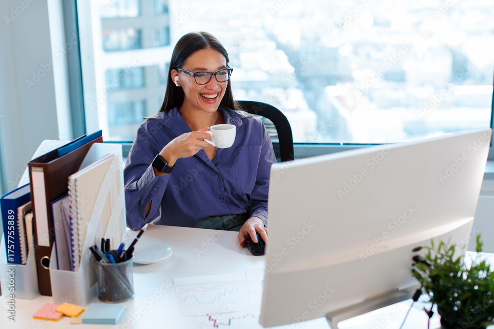 Excited European businesswoman drinking coffee at workplace, looking at computer monitor screen and smiling, having video call, free space